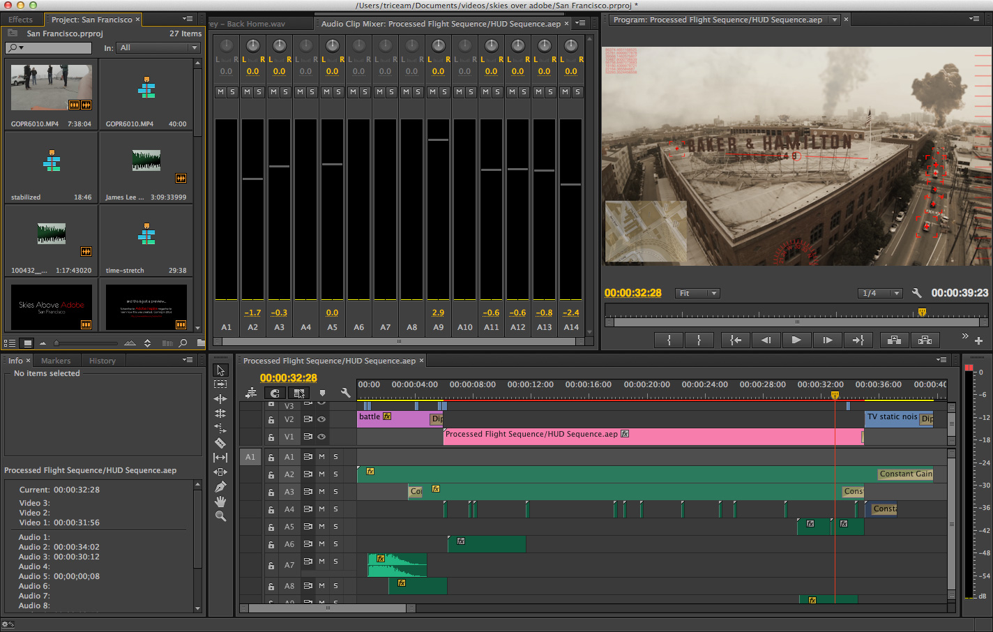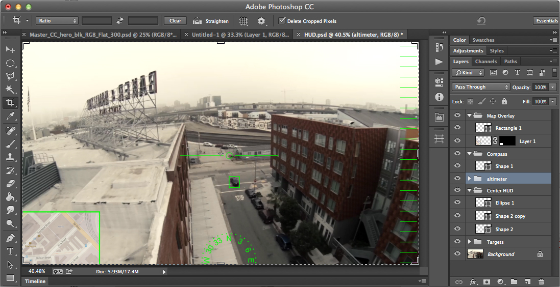 In my last post, I proclaimed my love for Adobe Creative Cloud. This post will show you the reason why. I was playing around with some of the aerial footage I captured last week in San Francisco. Just for fun, I wanted to create a HUD (heads up display) to add to the first-person experience of the video. My inspiration was the HUD created for The Avengers & Iron Man, which was created using Adobe After Effects. This turned out far better and far more interesting than I could have possibly hoped, and it is all thanks to the power of Adobe Creative Cloud. Here’s the final video complete with special effects, and below I will discuss how I used Creative Cloud to get to this. (Best experienced at 1080p, with audio - preferably loud, with lots of bass.)