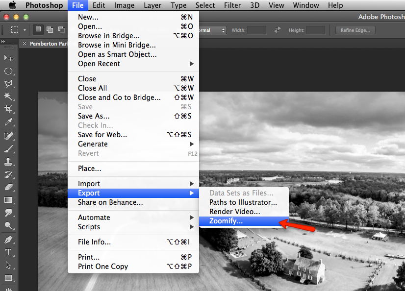 - When you have a file open that you want to export, choose File -> Export -> Zoomify