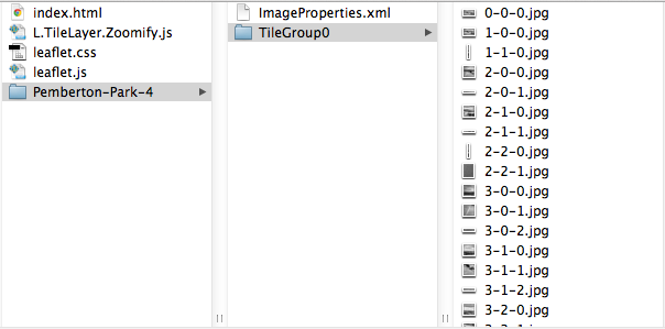- This will generate all of the image tiles and the HTML structure. From here, do whatever you want with it… You can modify it, put it on a server, or anything else. the file output will look something like the image below. You will have a folder that contains the generated HTML file, the Leaflet JS and CSS files, and a directory that contains the generated tiles and appropriate XML metadata.