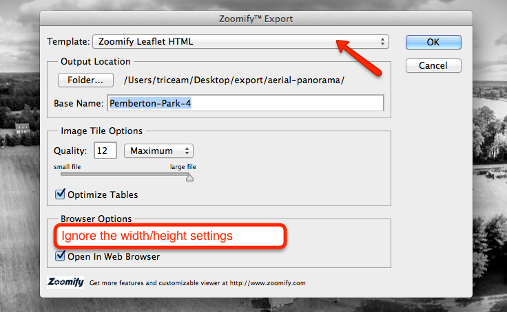 - Then select the “Zoomify Leaflet HTML” template that should now be in the list. Select an output location, base name, and image options, and hit “OK”. Ignore the browser width and height, since the template ignores these. Instead, it takes 100% of the width and height of the browser window.